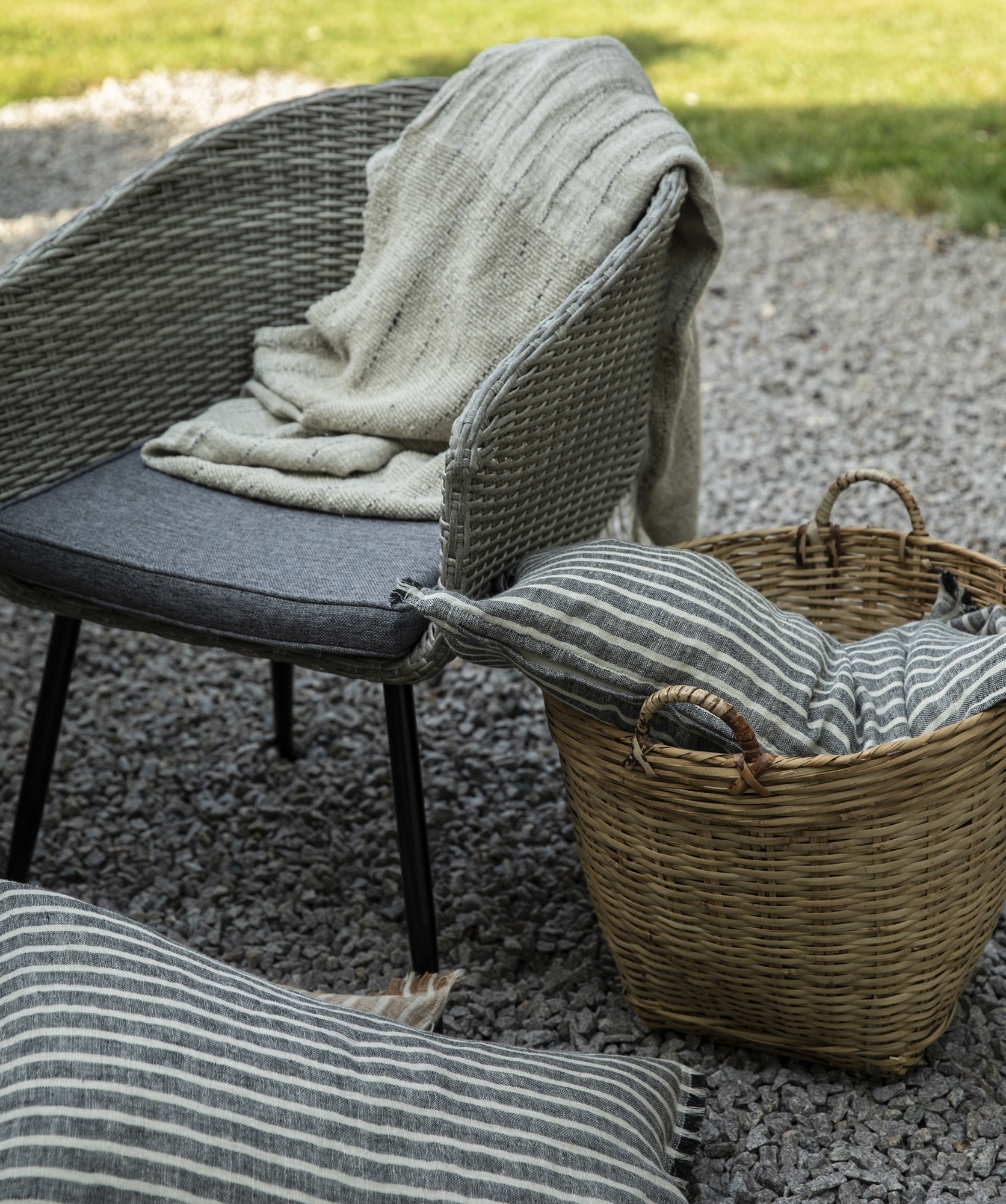 Matstol Aster i grå konstrotting med svarta metallben. För att ge en skön komfort medföljer en matchande mörkgrå dyna. Perfekt till bordet på uteplatsen eller i uterummet.