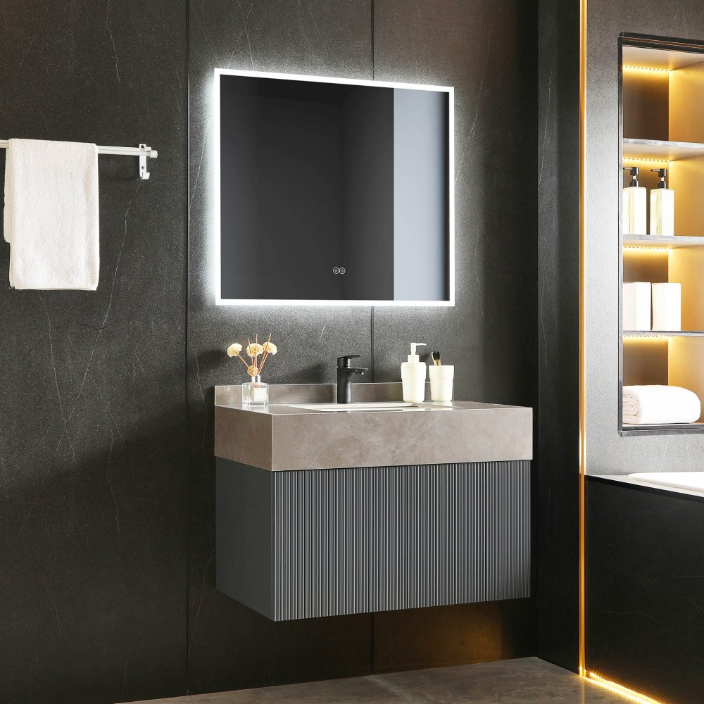 Ge badrummet ett lyft med ny inredning! Detta möbelkit har en bänkskiva som är tillverkad i mycket tålig sintrad sten, som med sin eleganta design gör sig väl i det moderna badrummet. I köpet ingår en kommod med grå finish, en svart tvättställsblandare, ett keramiskt handfat med svart bottenventiI och en spegel med lyxig inbyggd LED-belysning, dimmer och antifog-funktion. Handfatet är nedsänkt i bänkskivan, och blandaren och bottenventilen går i matchande ton.