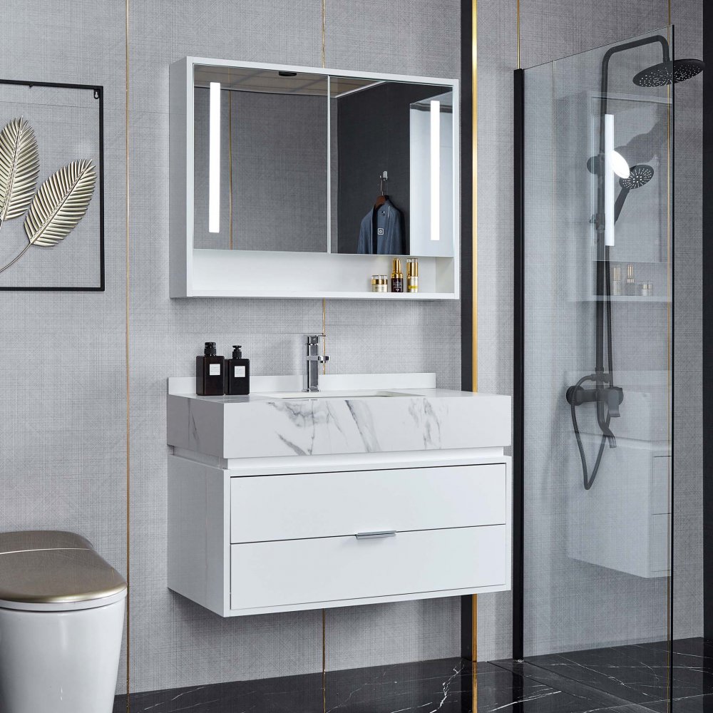 Badrumsmöbel 90cm | LED-spegelskåp | Marmorerad bänkskiva | Vit