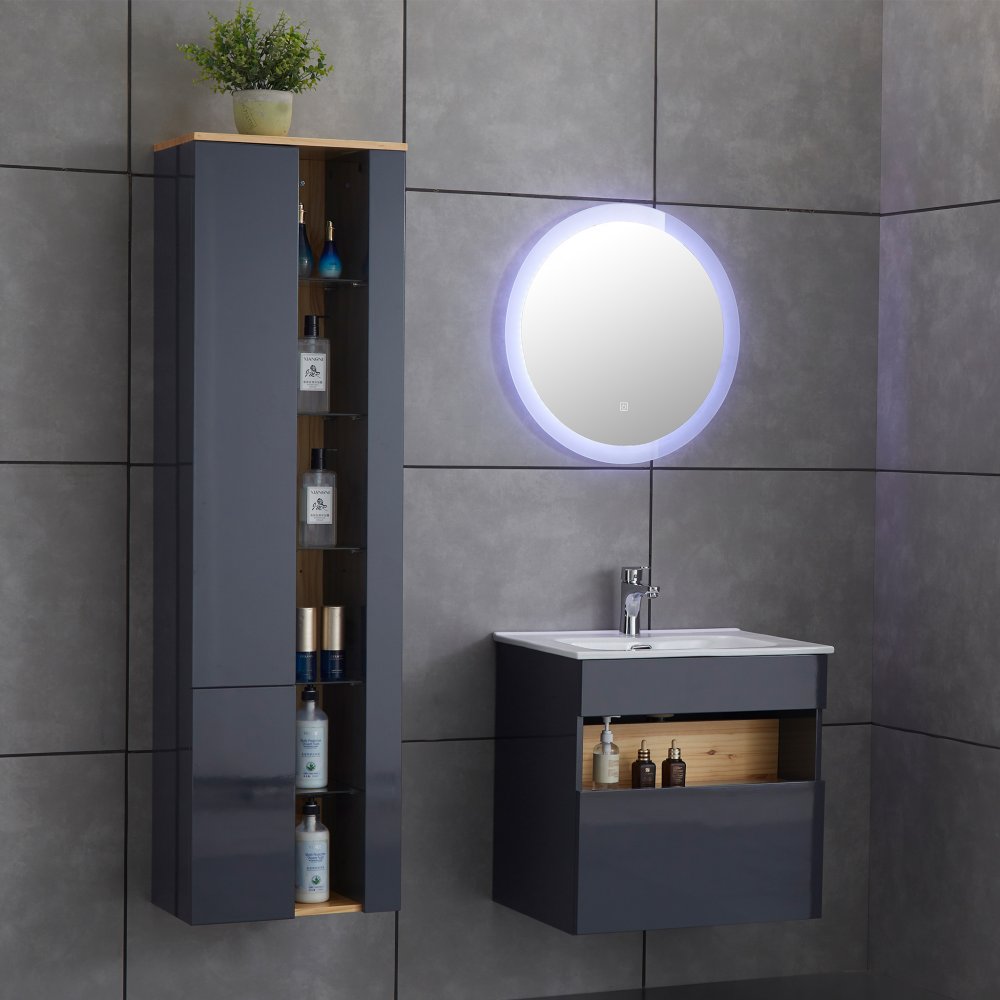 Badrumspaket | Kommod, LED-spegel och högskåp | Högblank grå