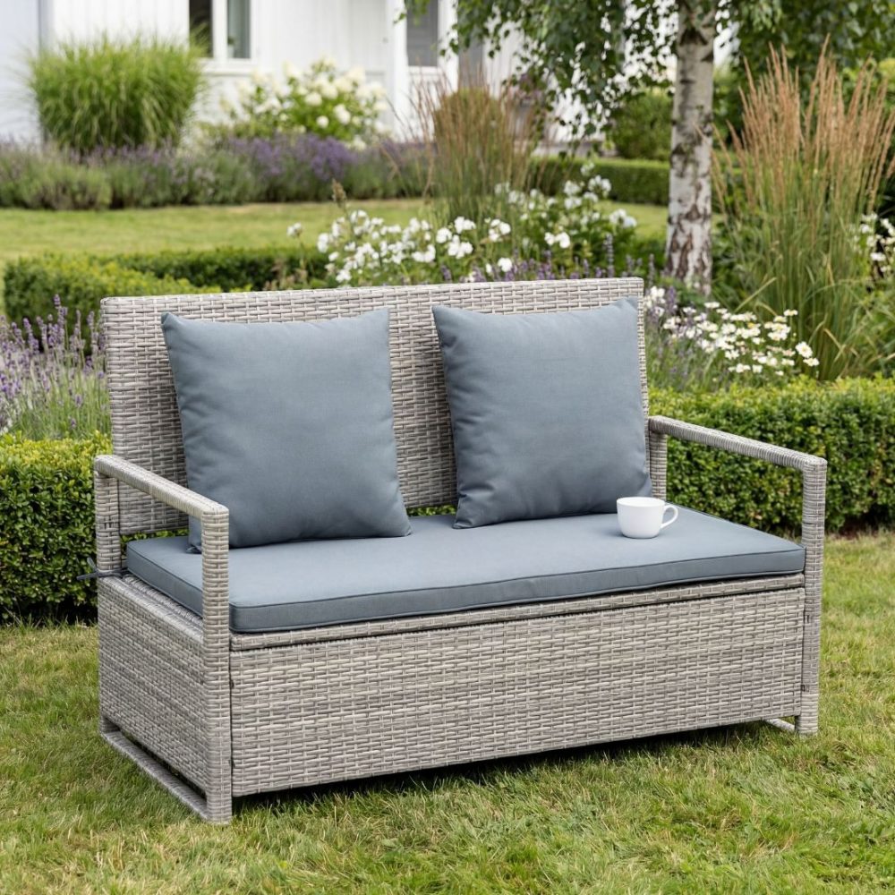 Bänk med dynförvaring 129 cm | Grå konstrotting | Dynor ingår | Boxvik