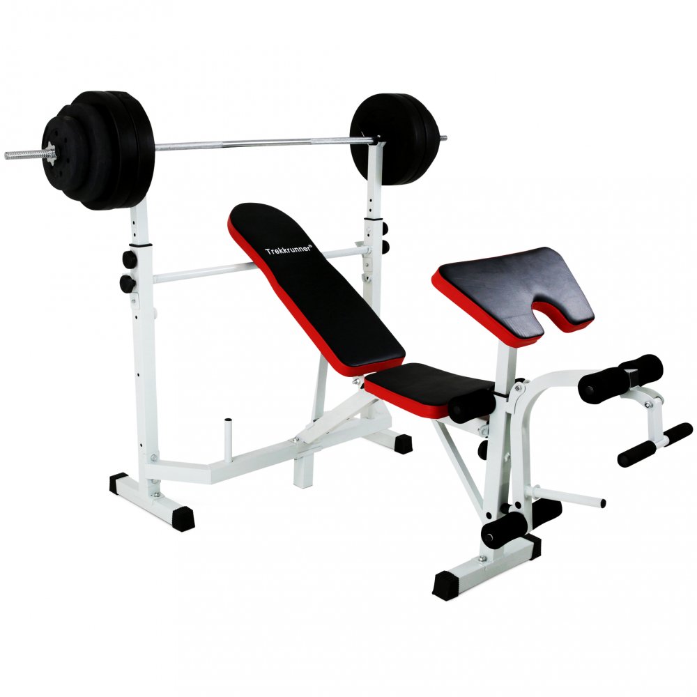 Skivstångsset av hög kvalitet. Träningsbänk av kraftig modell med totalt 63kg vikter från Trekkrunner. Fantastiskt bra paket för styrketränare som vill ha lika bra grejer hemma, som på gymmet. Gratis frakt ingår