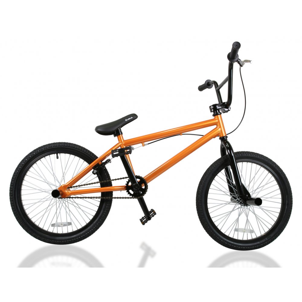 Bra freestyle BMX cykel i orange metallic färg med styre som kan vridas 360°. Tuff BMX cykel som klarar sig bra vid krävande freestyle-åkning eller i ramp.