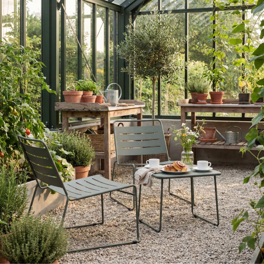 Detta olivfärgade caféset i stål är ett smidigt och funktionellt val för dig som vill skapa en trivsam sittplats på begränsad yta. Med sitt kompakta format och rena design passar setet utmärkt på balkong, liten uteplats eller innergård – utan att kompromissa med stil eller funktion.