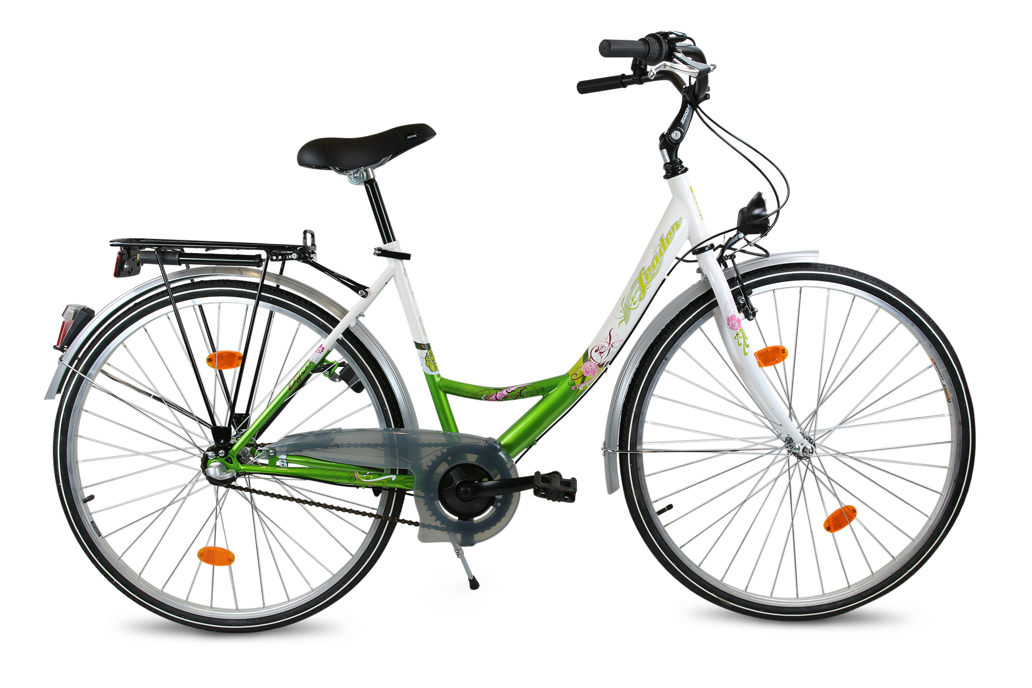 - Lyse fram/bak, ringklocka, kedjeskydd och cykelpump medföljer.
