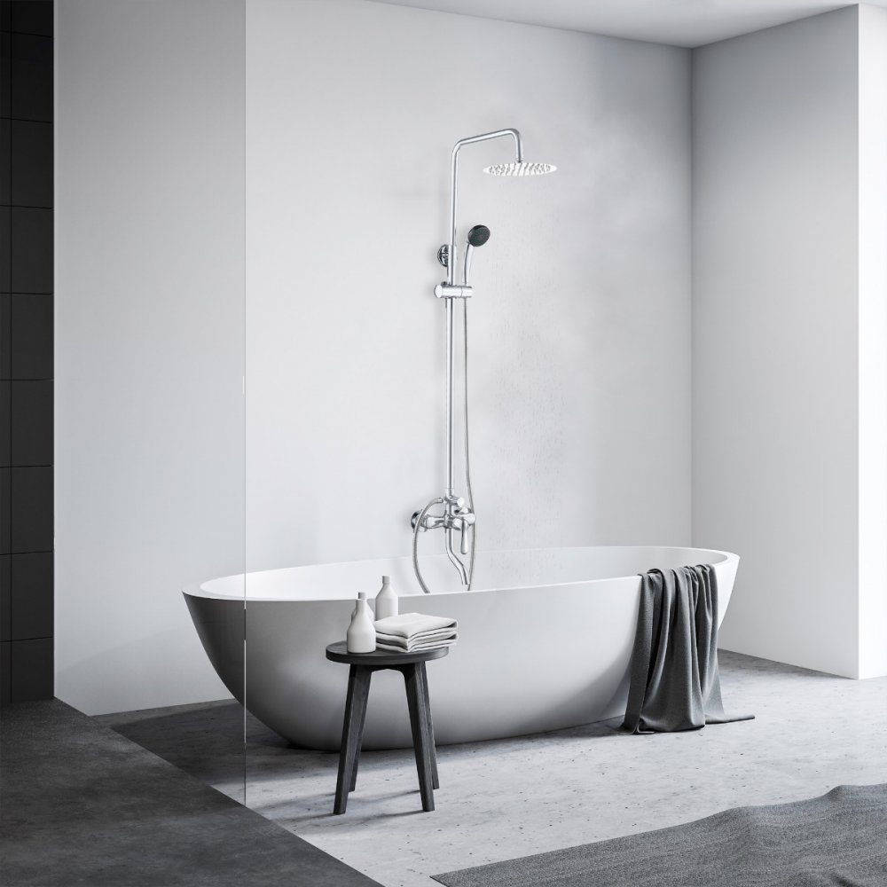 Komplett duschpaket i rostfritt stål för dusch eller badkar med blandare med badkarstapp, takdusch och handdusch. Takduschsetet har en modern, stilren design som passar väl in i alla typer av badrum. Handduschen levereras med 1,5 m lång duschslang i rostfritt stål och duschhandtag i ABS-plast. Duschstången fästes i väggen och är utrustad med höj- och sänkbar hållare för duschhandtaget.