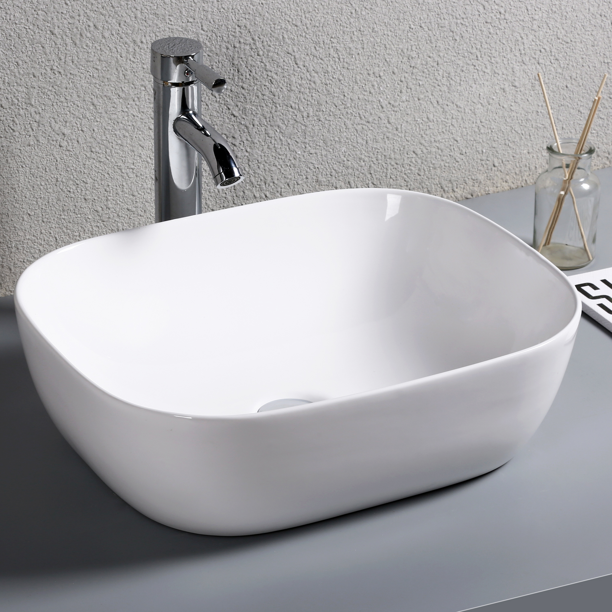 Fristående handfat för placering på bänkskiva med en elegant design med mjuka linjer. Handfatet är tillverkat helt i keramik/porslin med en blank, slät yta och rundad tvättskål utan några skarpa hörn och vinklar, vilket gör att handfatet är lätt att hålla rent.