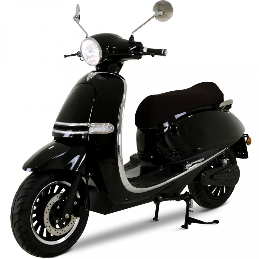 Denna elmoped har generöst med utrustning och finns i flera olika färger. Mopeden finns i vitt, svart/brun, helsvart, rosa och metallic röd och har försetts med grova däck på 12 tums fälgar, rejäla skivbromsar fram och bak samt hydrauliska stötdämpare både fram och bak. Den väl tilltagna utrustningen för stötabsorbtion ger en otrolig komfort under färden. Den maximala användarvikten är 150 kg och elmopeden klarar av att ta sig upp för backar med upp till 25 graders lutning. Mopeden har också utrustats med ett extra långt säte samt utfällbara fotstöd för passagerare så att du kan skjutsa på mopeden tryggt och säkert.