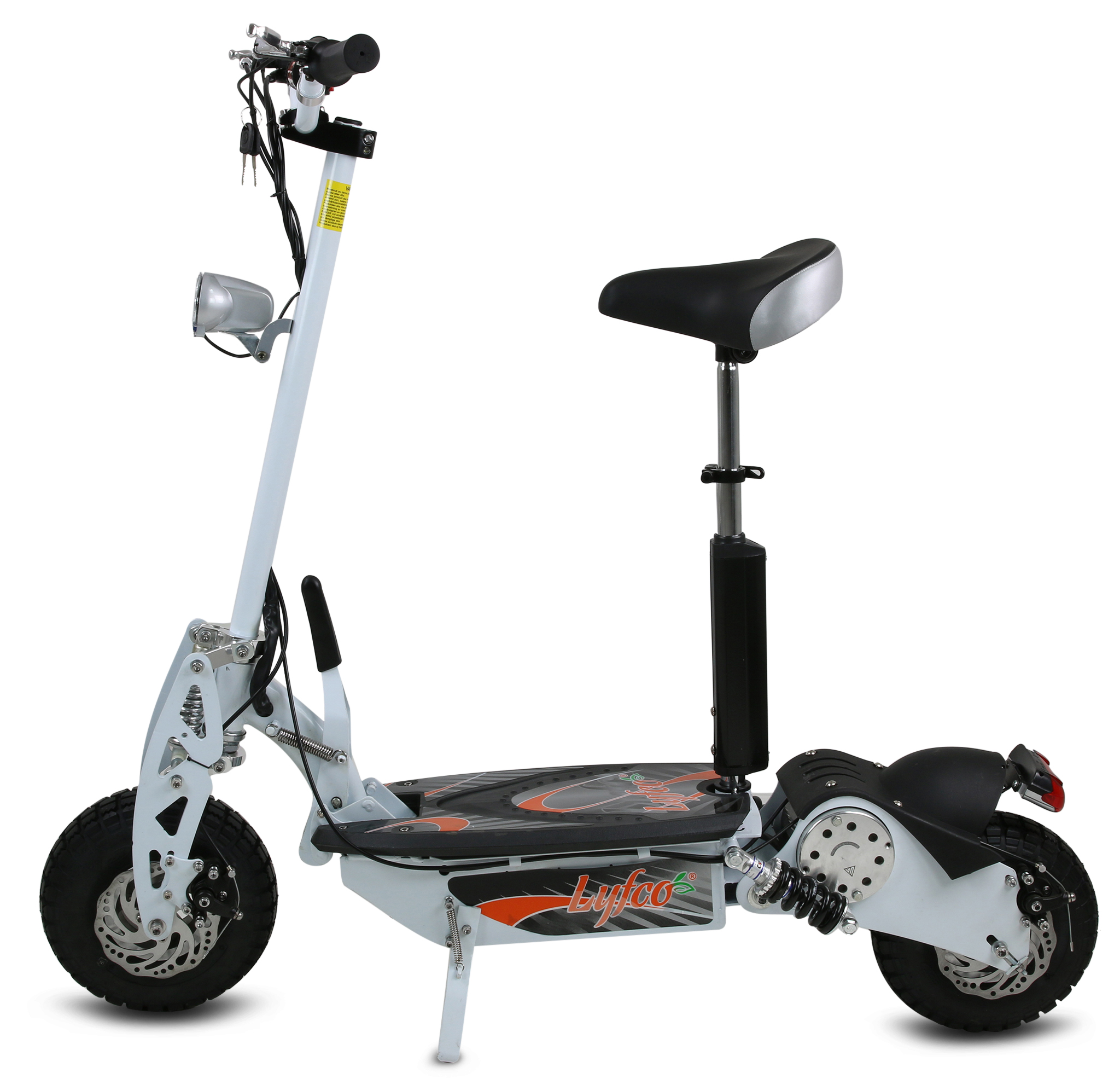 Tuff elsparkcykel med 800W kedjedriven motor som går i upp till 32km/tim. Mycket praktiskt transportmedel som knappt tar någon plats att förvara. Elsparkcykeln är utrustad med 10" luftfyllda terränghjul på stor aluminiumfälg vilket gör att den lätt tar sig fram på lite svårare underlag. Elscootern har LED lyse både fram och bak, samt bromsljus bak. Motorn är mycket stark, och den har inga problem att bära en fullvuxen då max användarvikt är hela 140kg. Denna elscooter är också utrustad med rejäla skivbromsar både bak och fram, vilket gör att du enkelt och säkert kan stanna. Bakdelen av scootern har en kraftig fjädring vilket gör att elscootern går mycket mjukt.