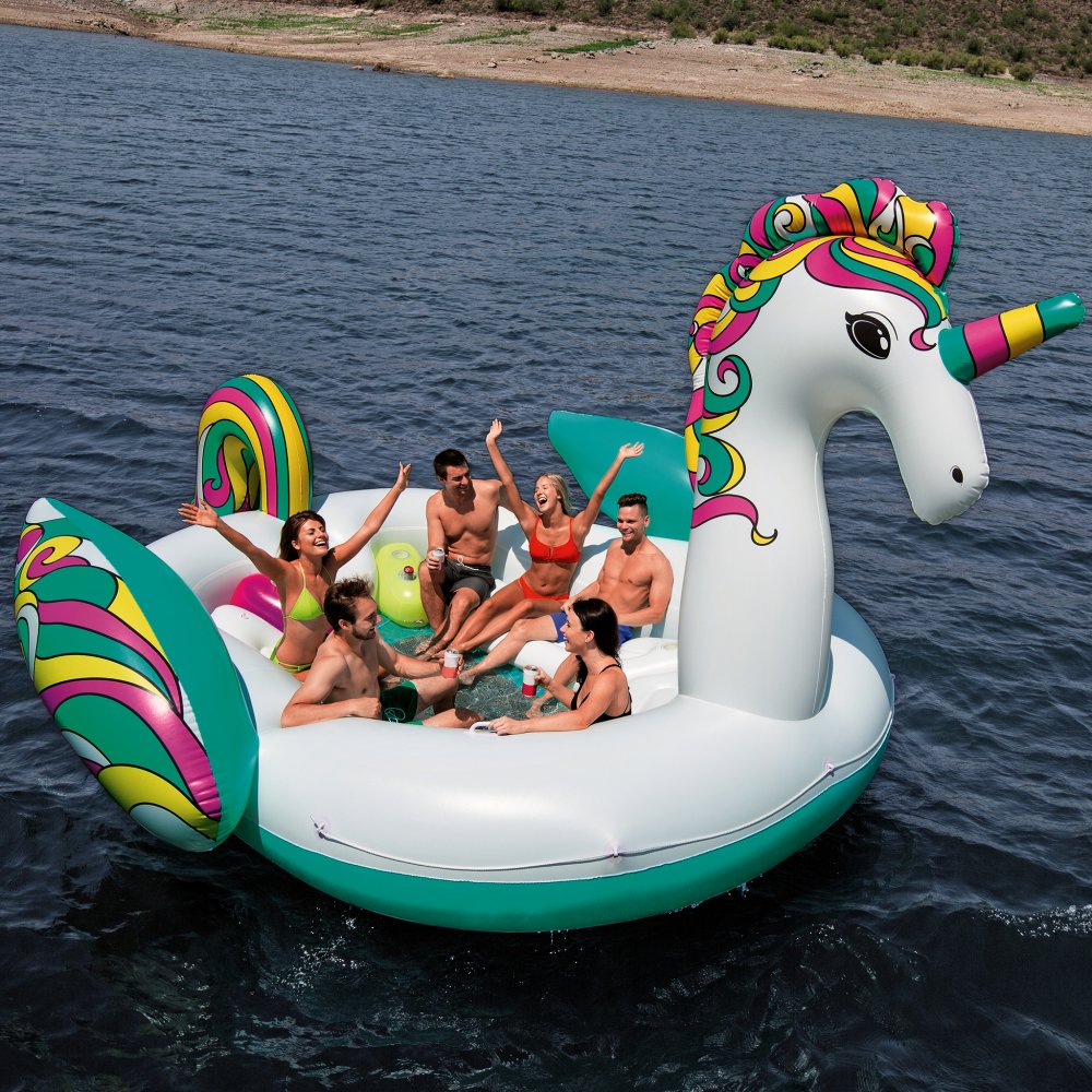 Giant Unicorn Float är anpassad för 6 personer och är utrustad med bekväma sittplatser med extra breda ryggstöd, sex stycken mugghållare samt en "jumbo-hållare" där det får plats flera svalkande drycker för varma dagar på sjön. Bottnen på enhörningen är tillverkad i nät vilket gör att den släpper igenom vatten och därmed skapar ett svalkande fotbad bildas i mitten av flotten. Dessutom är enhörningen utrustad med en flytbrygga i bak som du kan hänga på när du väljer att ta ett dopp!