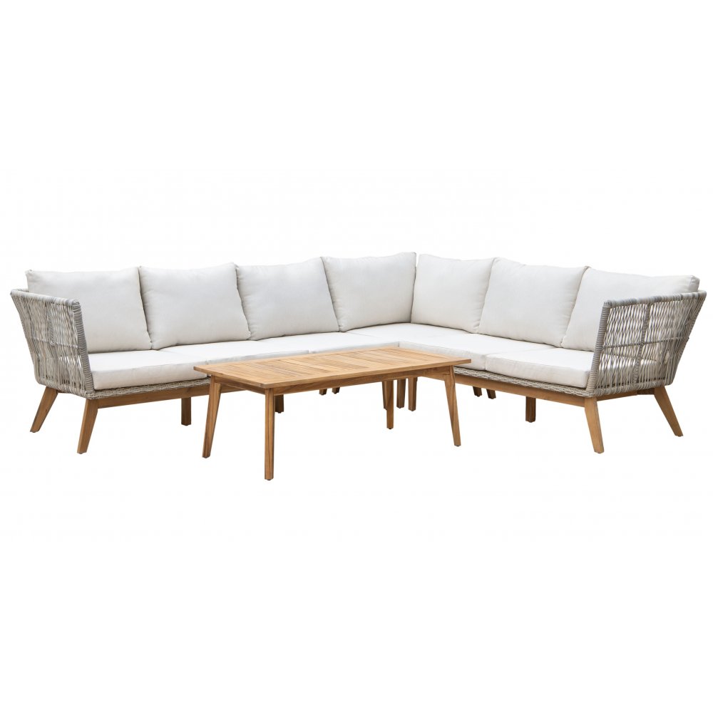 Inez är en utegrupp innehållande en stor och rejäl hörnsoffa med alumnimumstomme som är beklädd med konstrotting av väderbeständigt material. Komplett dynset med 230 grams beige kvalitetstyg. Tillhörande bord i FSC Acacia trä. Placera utegruppen på uteplatsen eller i orangeriet för att få en komfortabel loungeplats till familj och gäster.