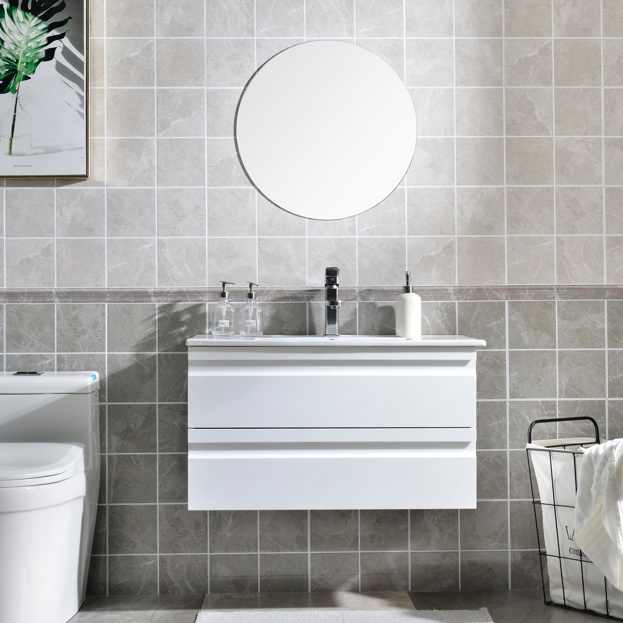 Observera att endast tvättställsskåpet ingår i denna produkt. Eventuella sidoskåp och speglar i bilderna ingår ej.