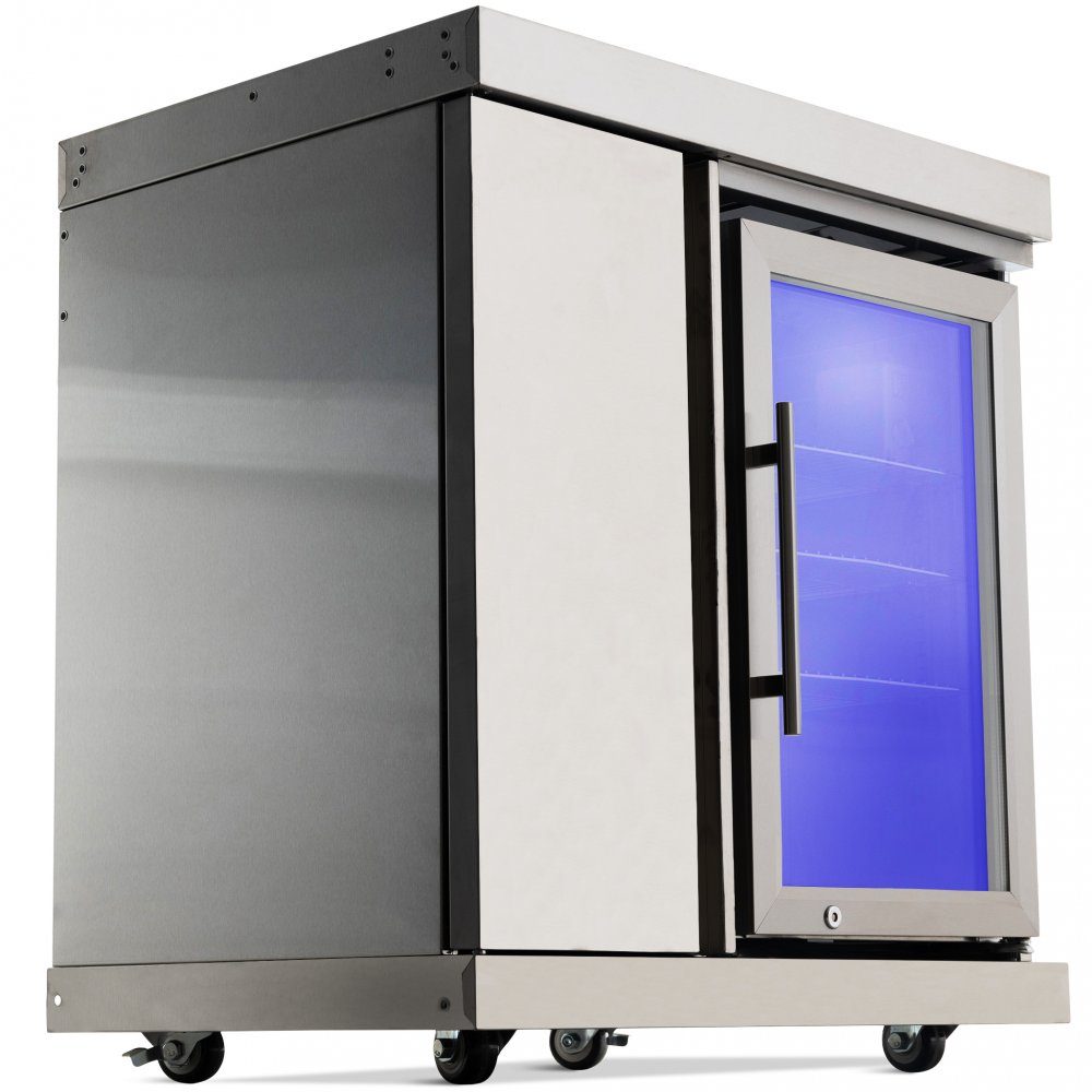 I kylen finns en svag blå belysning. Dörren är av glas, och är även låsbar med medföljande nyckel. Bredvid kylen finns ett förvaringsskåp med tre hyllplan av rostfritt stål. Temperaturen i kylen kan ställas mellan 1-10 grader C. Strömanslutningen är 230 V (vanlig stickkontakt). Dimensioner (Höjd x Bredd x Djup) 885 x 830 x 610 mm. Grillen har 4 hjul varav 2 är låsbara.