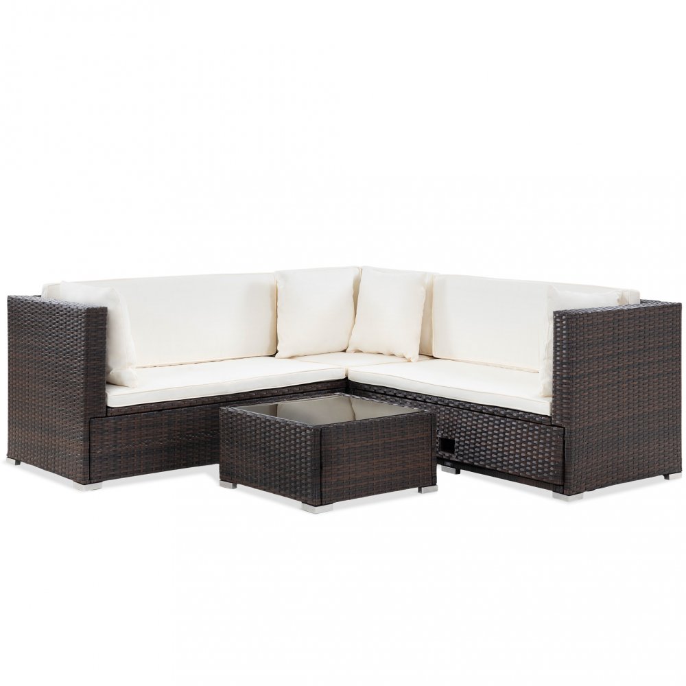 Platsbesparande loungegrupp utemöbler i mörkbrun konstrotting av hög kvalitet med en smart inbyggd, regnavvisande förvaring i sitsen för t ex dynor, kuddar och filtar. Så nu behöver du inte köpa till platskrävande och dyra dynboxar för att hålla dina dynor skyddade från regn och smuts! Förvaringen kommer du enkelt åt genom en lucka på framsidan av soffan och sedan är det bara att skjuta in dynorna. Du behöver alltså inte lyfta på någon tung sits för att komma åt förvaringen.