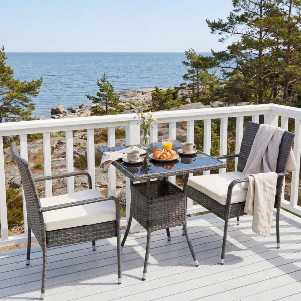 Stilrent litet caféset utemöbler i konstrotting av hög kvalitet. Lyfco Mölle är ett perfekt caféset för balkongen eller den mindre uteplatsen. Bord, 2 st stolar samt sittdynor med en tjocklek på 5 cm ingår. Bordet är 60 x 60 cm samt 73 cm högt och har en 5 mm tjock glasskiva av mörkt härdat glas. Rottingen är handvävd i tät grå väv. Dynornas klädsel är avtagbar och därmed lätta att tvätta i maskin.