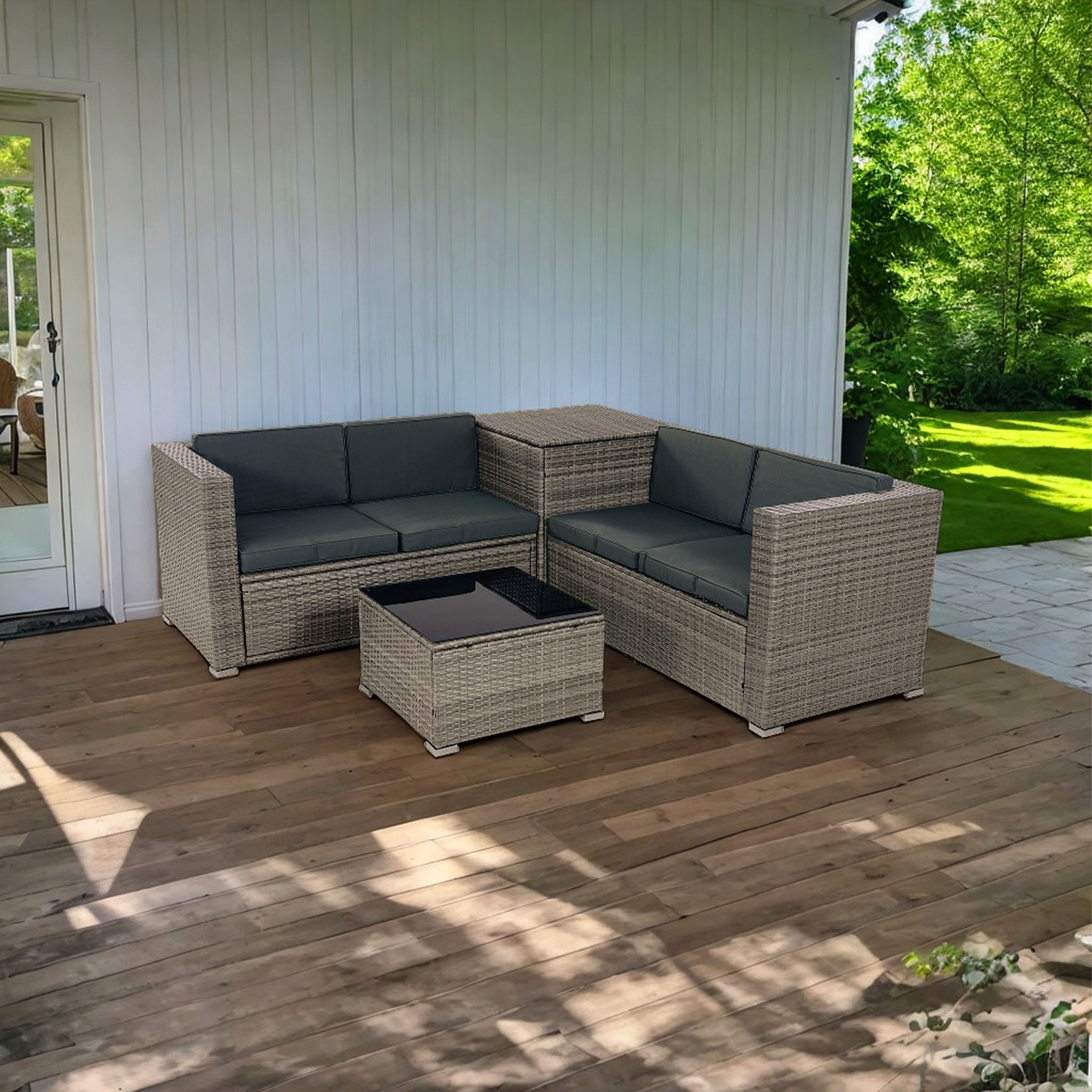 Exklusiv och ergonomisk loungegrupp i konstrotting av hög kvalitet med smart inbyggd, regntät förvaring och medföljande bord samt ett sidobord med inbyggd, regntät dynbox. I de två generösa förvaringsutrymmena kan du förvara t ex dynor, kuddar, filtar eller varför inte dina favoritböcker? Du behöver alltså inte köpa ytterligare platskrävande och dyra dynboxar för att hålla dina dynor skyddade från vädrets makter. Dynboxen i sidobordet är mäter 65 x 65 cm och 65 cm hög. Locket kan ställas upp med en automatisk spärrfunktion.