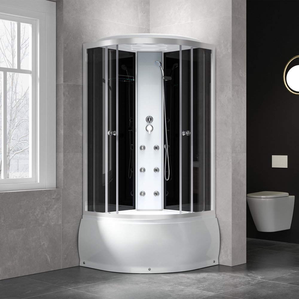 Elegant duschkabin med massage som gör att du kan skapa dig ditt eget hemma-spa! Duschen är utrustad med takdusch, handdusch och sex stycken munstycken för ryggmassage. Du växlar enkelt mellan dessa funktioner med hjälp av duschens reglage. Duschkabinens mörka glasrygg skapar en dov och mjuk ljusreflektion som är vilsam för ögonen, samtidigt som den bidrar till att knyta ihop designen till en stilren helhet. Kabinen har också en smart integrerad sittplats i anslutning till massagemunstyckena - allt du behöver för högsta möjliga bekvämlighet!