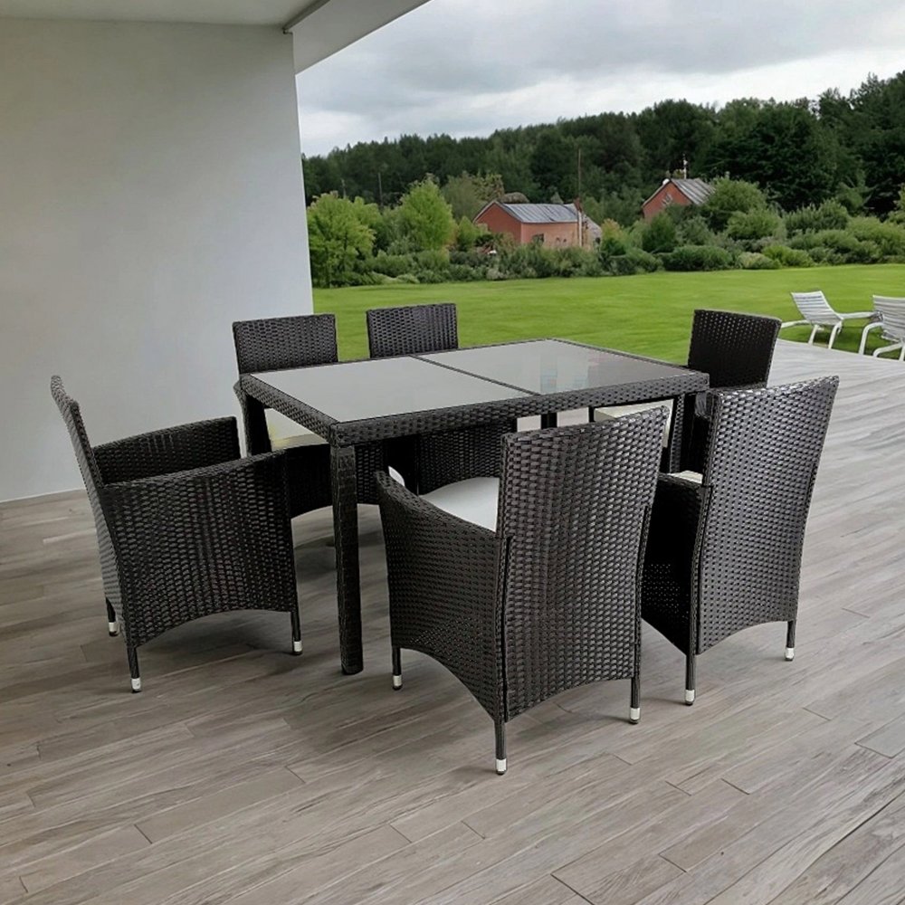 Representativ matgrupp utemöbler i vävd konstrotting. Bord samt 6 stycken stolar ingår. Bordet är 130 x 90 cm och har en bordsskiva av transparent härdat glas med tjocklek 5 mm. Rottingen är handvävd i tät svart väv. Dynorna ingår (värde 750 kr).