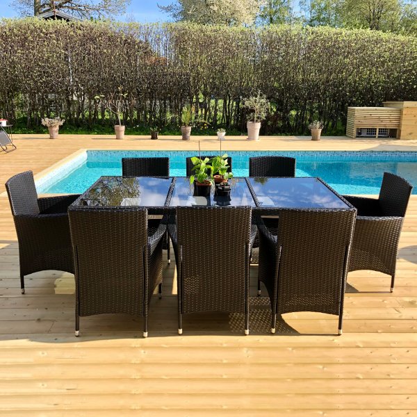 Stilren och elegant matgrupp utemöbler i sobert svart konstrotting av hög kvalitet. Gruppen innehåller ett stort bord samt 8 st bekväma stolar med rejäla armstöd för hög komfort. Bordet är 220 cm långt och har en 5 mm tjock bordsskiva av svart härdat glas uppdelat i 3 sektioner. Rottingen är handvävd i tät mörk väv. Dynorna ingår (värde 1000 kr) i denna matgrupp utemöbler.