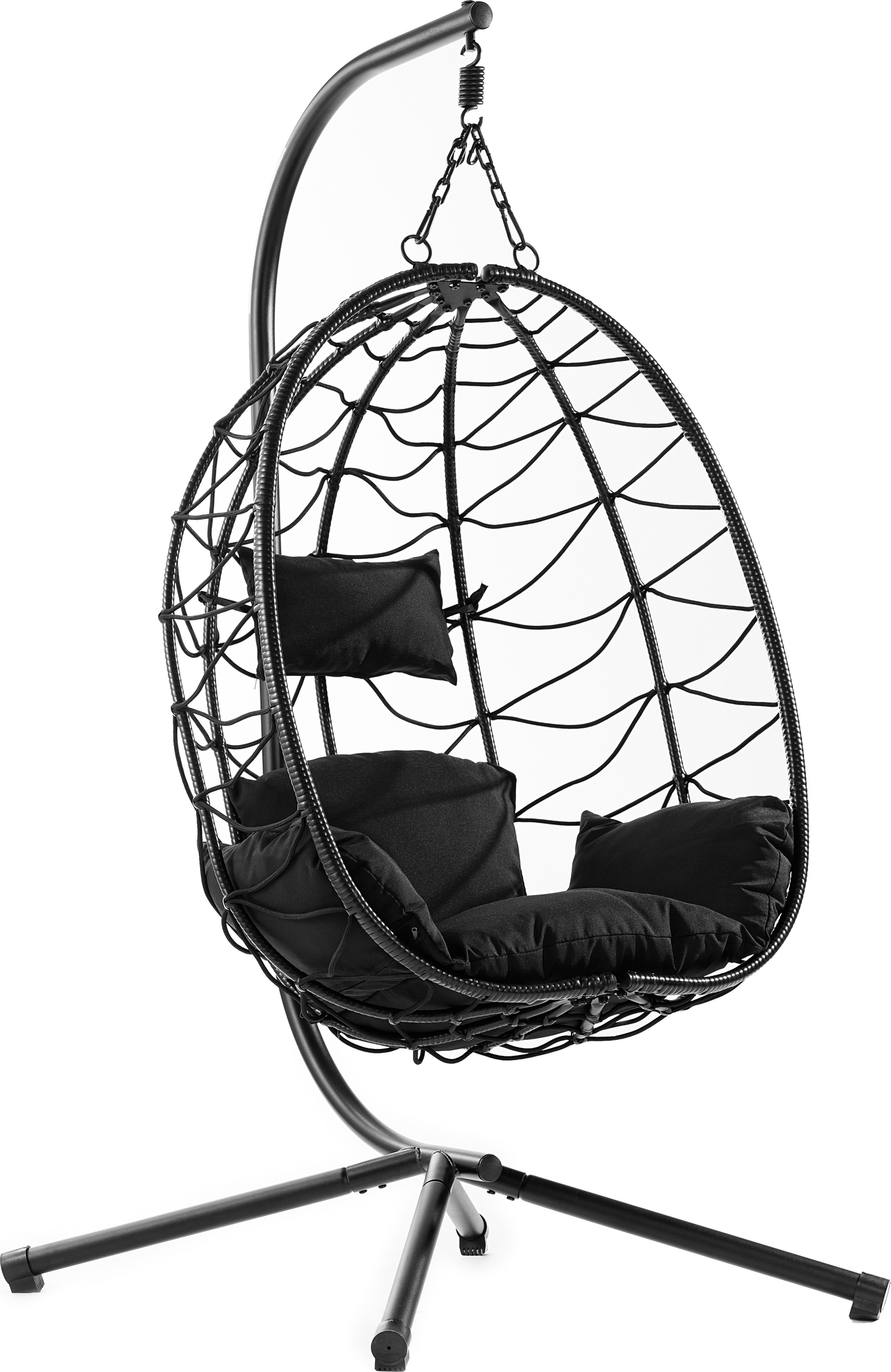 Miami Hängstol för utomhus. Relaxa i solen med vår sköna hängstol i svart konstrotting och vädertålig plast. Ställning i svartlackad metall.
