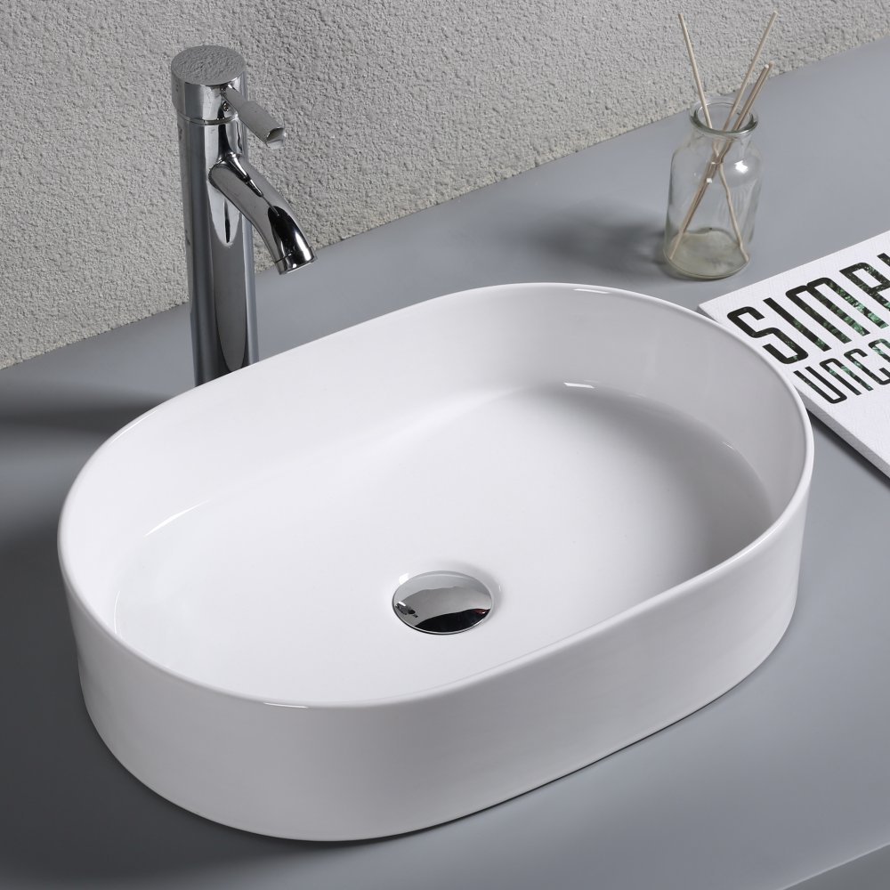 Fristående handfat för placering på bänkskiva med en modern, oval design med tydliga, skarpa linjer. Handfatet är tillverkat helt i keramik/porslin med en blank, slät yta och rundad tvättskål utan några skarpa hörn och vinklar, vilket gör att handfatet är lätt att hålla rent.