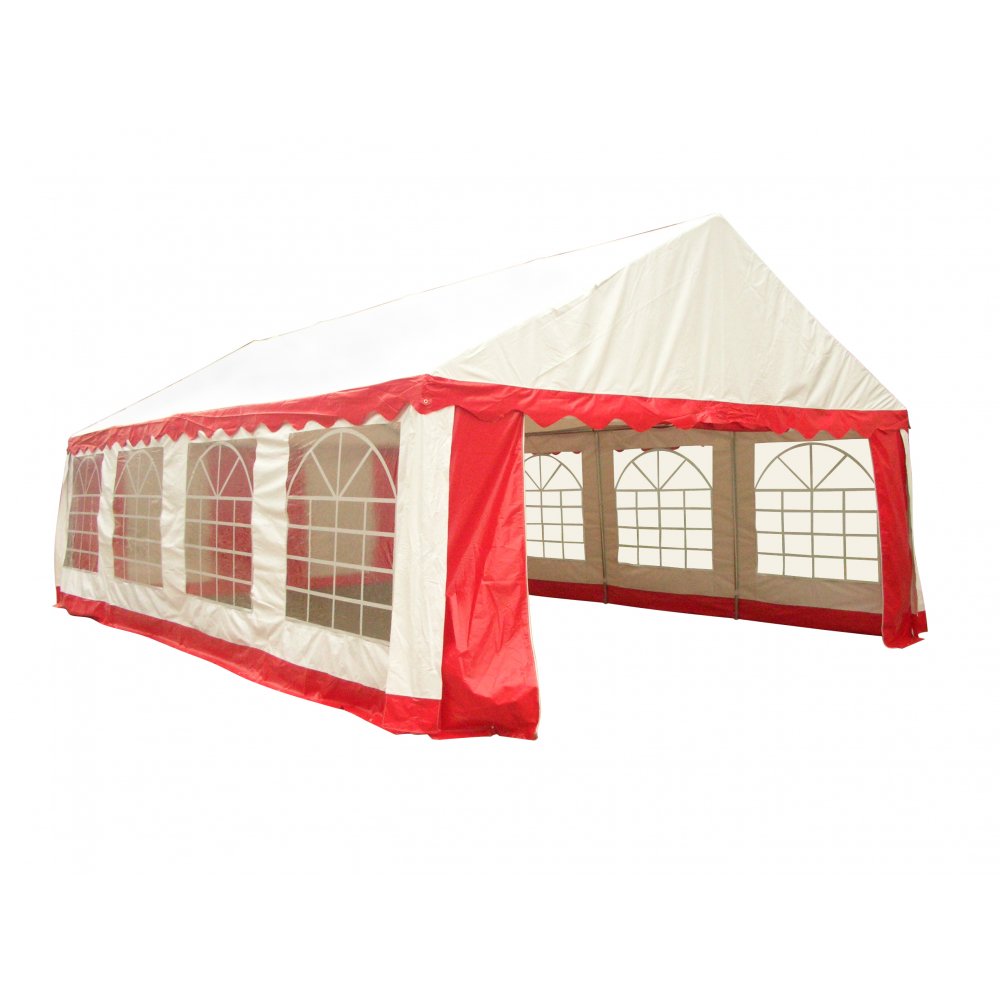 Regntätt partytält i kraftigt PVC material av rejält tilltagen kvalitet på material. 4x8 meter stort och 3,1 meter högt vid nocken. Ca 2m högt vid sidorna. Vikt hela 115 kg, vilket indikerar hur kraftigt material som använts i detta tält. Stolpar av galvaniserat stål, som är mer hållbart än pulverlackat stål. Alla stolpar har en diameter på 38 mm vilket gör det mer tåligt för regn och vind, än partytält med tunnare stolpar. PVC-tjockleken är hela 380 g/m² på taket och 300 g/m² på väggarna. Även alla kopplingar är av galvaniserat stål, jämfört mot billigare modeller av partytält som vanligtvis har plastkopplingar.