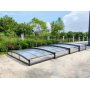 Detta pooltak är byggt med exklusiva mörkgrå aluminiumprofiler (45*65mm) och är täckt med kanalplastpaneler på taket och kortsidorna, medan långsidornas väggar är av klarglas. UV-skyddet på panelerna blockerar 98% av UV-strålarna, vilket inte bara skyddar mot skadliga strålar utan även bidrar till ökad isolering.