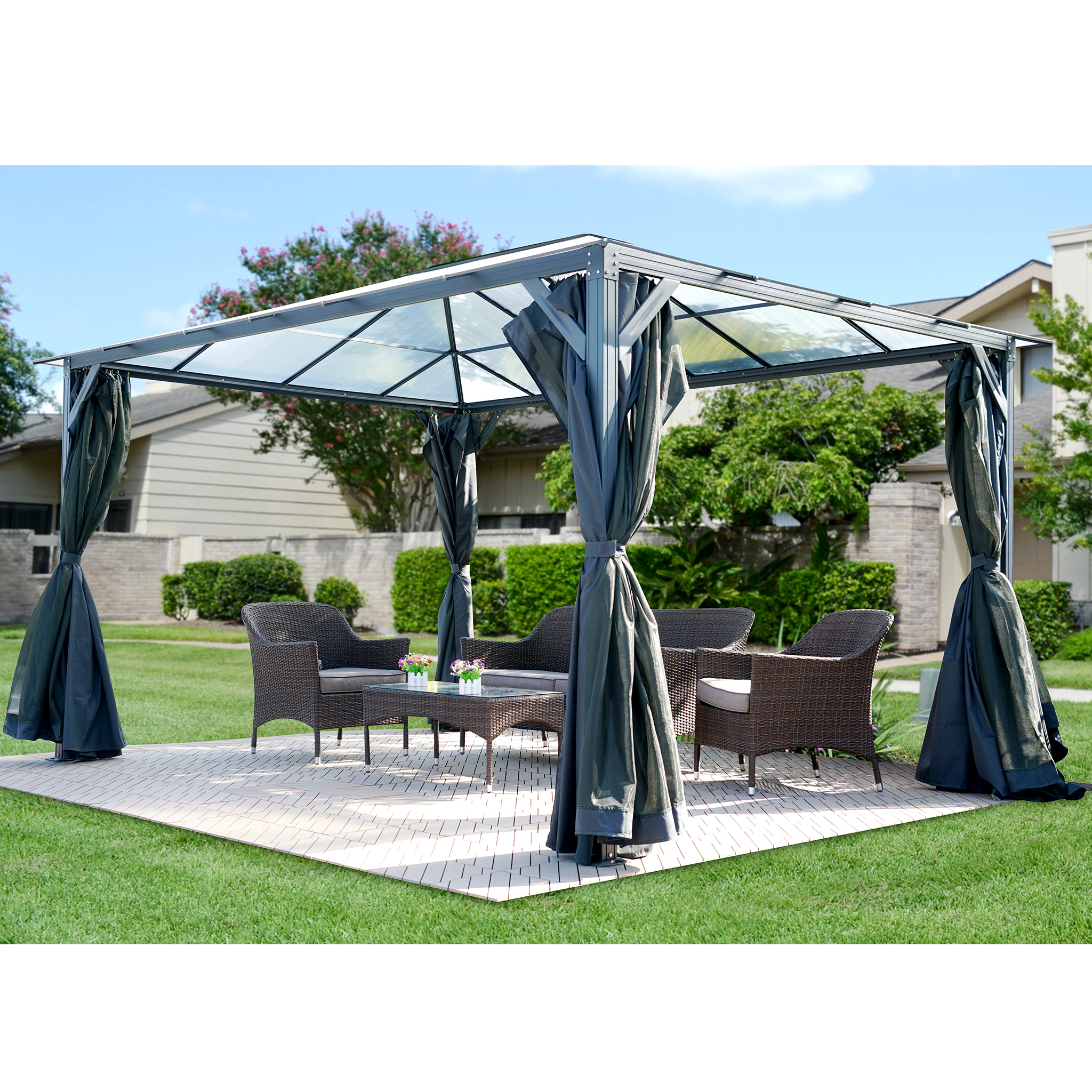 Lyxig trädgårdspaviljong/pergola i kraftig aluminiumkonstruktion och med rejält tak i slitstark 6 mm kanalplast som gör att paviljongen kan användas året runt och därmed ge dig mer glädje av din uteplats!