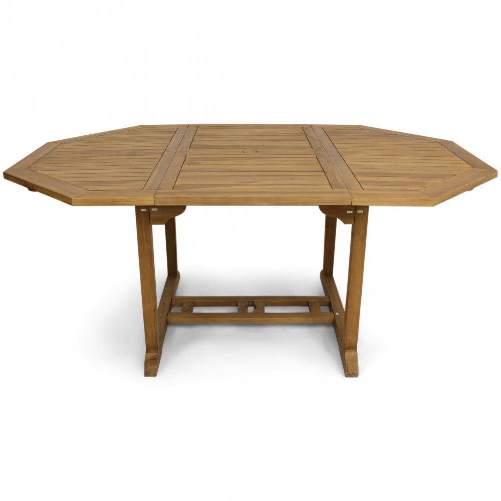 Stort förlängningsbart åttasidigt matbord 120-180 cm i teak. Teaken i denna möbelgrupp är i standardkvalitet, dvs den kvalitet som används i nästan alla bättre utemöbler i teak på marknaden. Bordet är behandlat med en vattenbaserad finish.