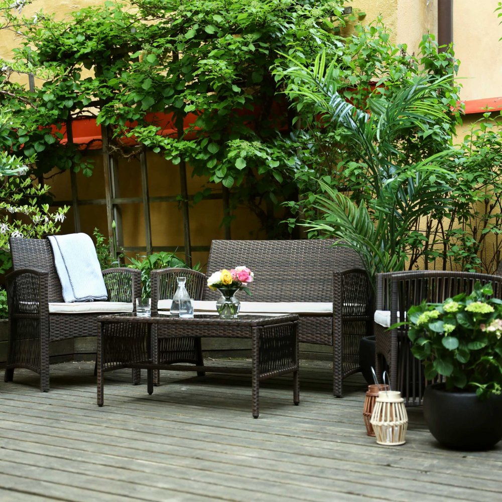 Konstrotting är mycket väderbeständigt, och utemöblerna kan stå ute i princip året runt. Rottingen är behandlad och vattenavvisande. Det kan vara bra att täcka över möblerna vintertid. Dynorna bör man dock ta in när det regnar.