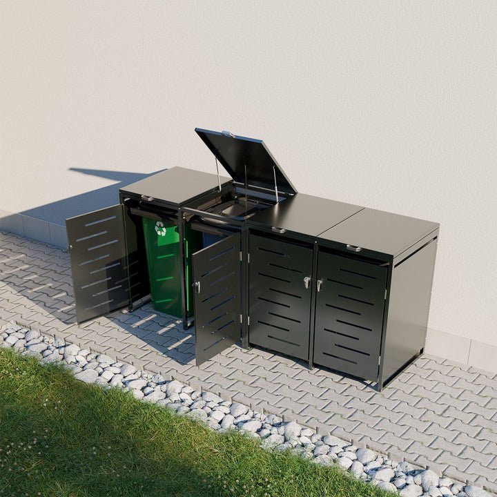 Praktiskt och stilrent soptunneskjul i pulverlackerad galvaniserad stålplåt, konstruerat för att ge ett diskret och prydligt intryck på uppfarten eller i trädgården. Skjulet rymmer två standard soptunnor och är utrustat med öppningsbara lock, låsbara dörrar och smart ventilationslösning.