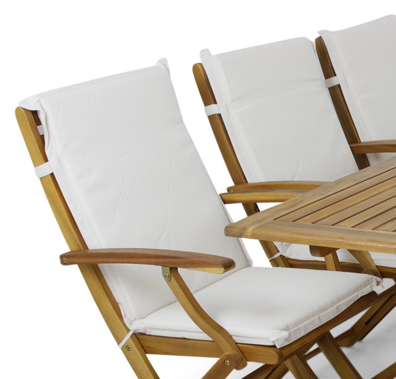 8 st vita stolsdynor för fällstolar. På bilden ser dynorna lätt gråa ut, men de är helt vita. Detta för att de ska gå att se på bilden mot den vita bakgrunden.
