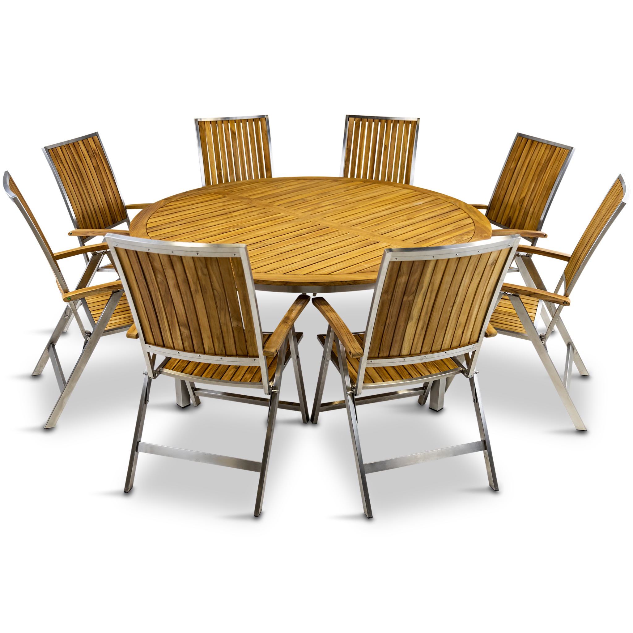 Stort runt trädgårdsbord i teak och rostfritt stål med 8 positionsstolar