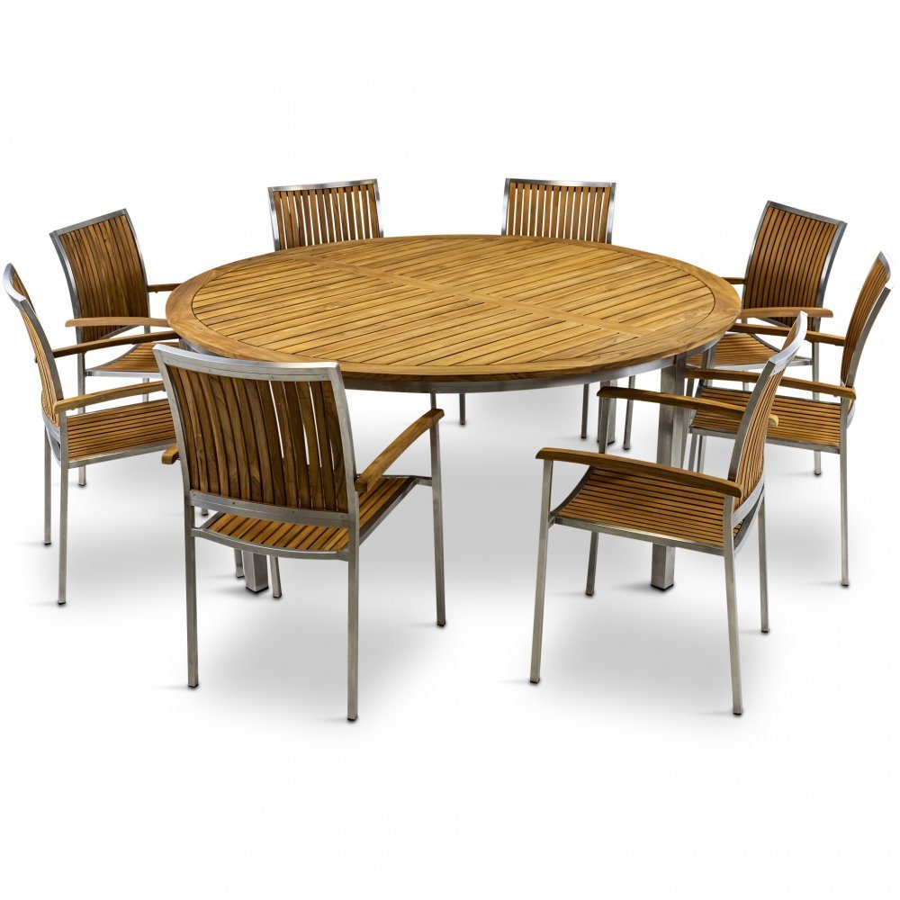 Stor rund trädgårdsgrupp i teak / rostfritt stål | Bord & 8 stolar
