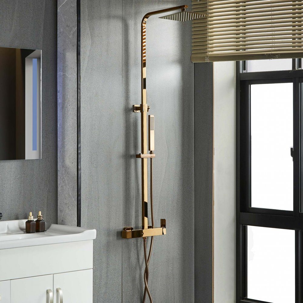Med sin kaxiga kantiga design och trendiga roséfinish är detta en takdusch som passar det moderna badrummet. Den metalliska färgen går väl ihop med en neutral färgpalett såväl som ett badrum med en poppigare ton, och den eleganta utformningen ger den annars så vardagliga duschen en härligt fräck ny stil.