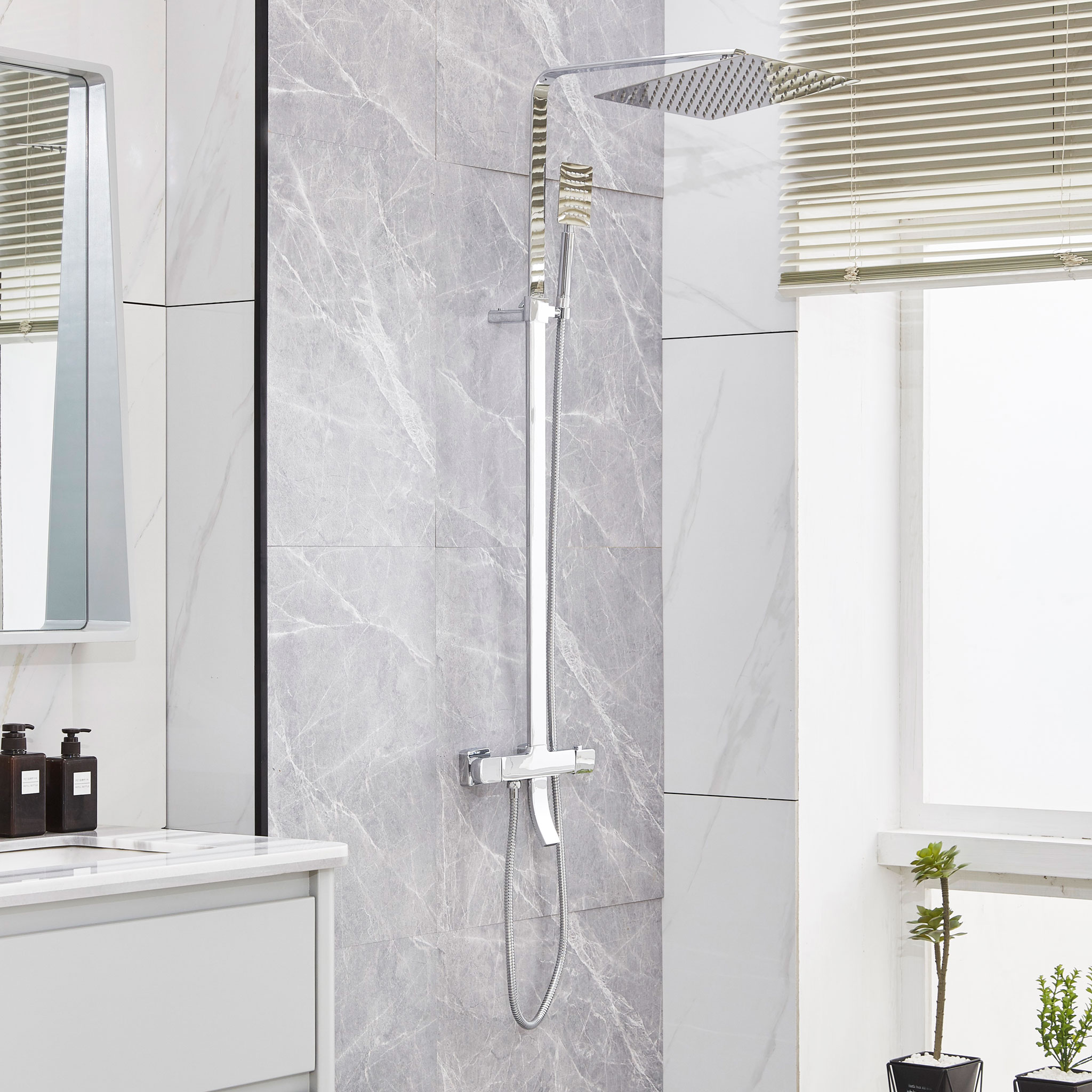 Med sin stilrena och moderna design är detta en dusch som passar de flesta typer av badrum. Duschsetet säljs komplett med termostatisk badkarsblandare, tak-/regn- och handdusch. Handduschen är utrustad med en 1,75 m lång duschslang och med handtag i rostfritt stål med spegelfinish. Duschstången är utrustad med höj- och sänkbar hållare för duschhandtaget och fästes enkelt i väggen med medföljande väggfäste i kromat zink som inte rostar och är lätt att rengöra. Takduschen är generöst tilltagen med ett mått på 30 x 30 cm. Njut av en lyxig regndusch som för tankarna till tropikerna.