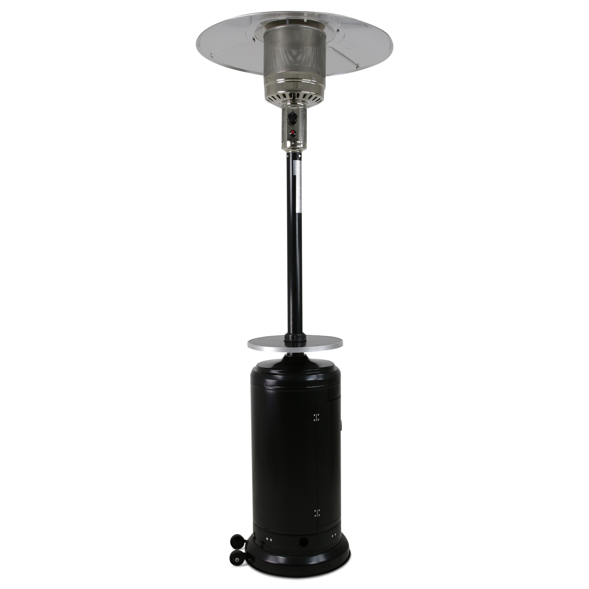 Kraftig terrassvärmare på hela 12 kW med reglerbar effekt (5-12 kW) i svartlackerad plåt. Denna modell har en liten hylla, och något större reflektor, samt extra stor tankbehållare. Tankbehållarens mått 378 mm diameter, höjd 780 mm. Praktiska hjul ingår så att terrassvärmaren går lätt att flytta.