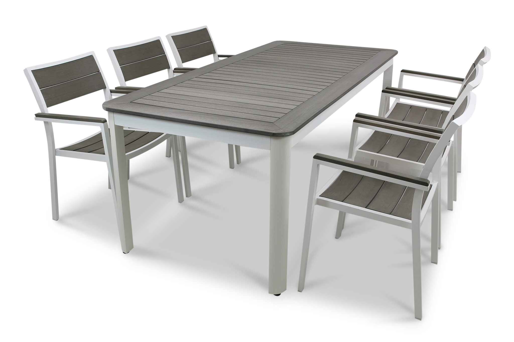 Matgrupp till uteplatsen i underhållsfri komposit och aluminium. I matgruppen ingår bord 200 cm samt 6 st stolar.