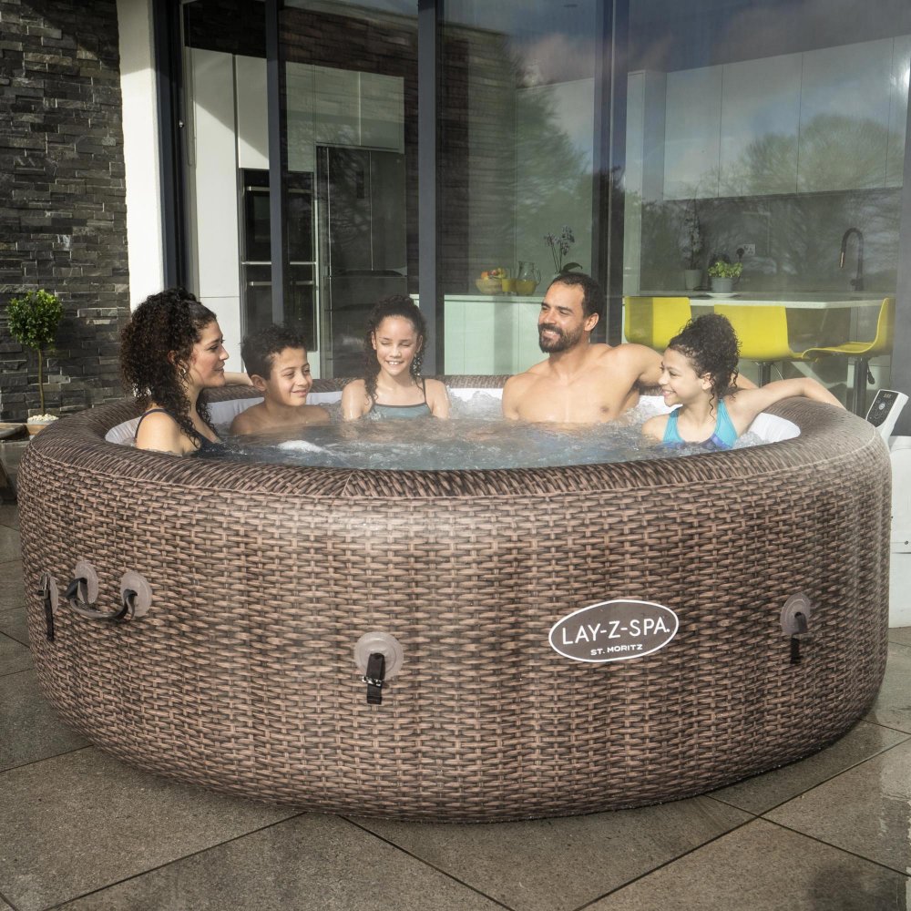 Längtar du efter att kunna värma dig med ett varmt bad under stjärnorna en kylig kväll? Med ett uppblåsbart spabad får du både lyx och funktion då dess portabla utformning gör att du kan placera det vart som helst samtidigt som du har samma funktioner som på ett platsbyggt spabad. Ingen montering krävs och du flyttar enkelt badet med dess två handtag. Spabadets massagefunktion har hela 180 AirJets™ med lugnande bubblor, allt för att ge dig den ultimata avkopplingen. St. Moritz kommer i ett läckert brunt rottingmönster på utsidan samt mosaiktryck på insidan som ger badet en snygg design.
