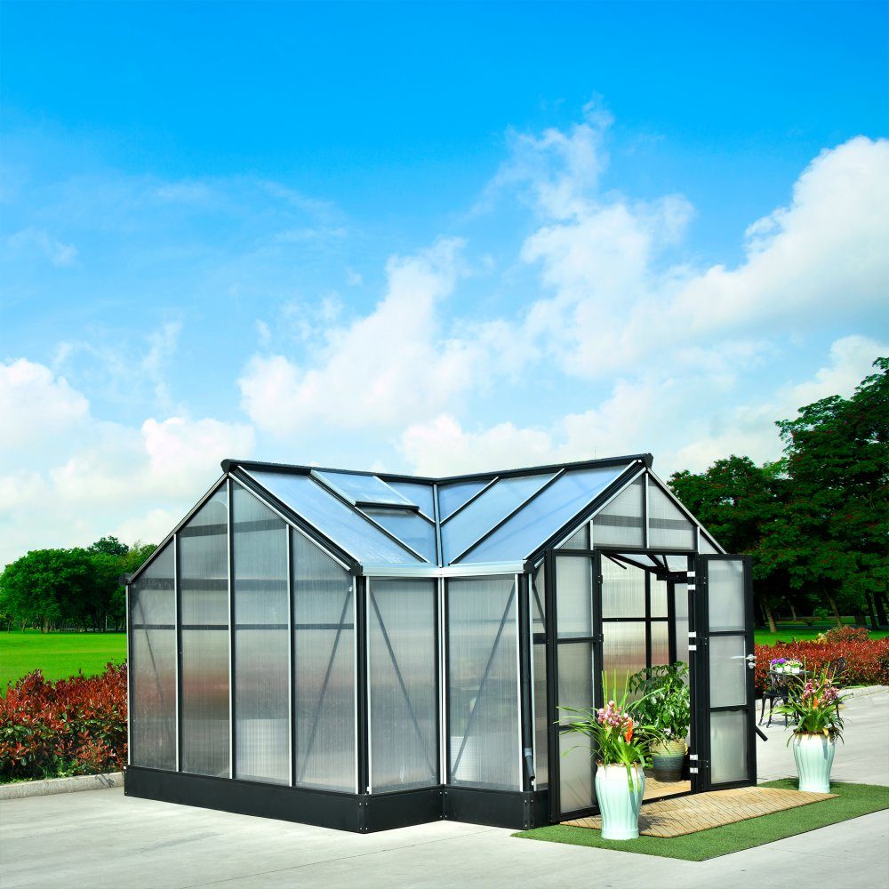 Detta växthus är tillverkat i 8mm kanalplast och med 1,6-3,5mm tjock aluminiumram. Ramen är lackerad i grafitgrå RAL7016 (värde ca 5000kr jämfört mot olackerad/naturell aluminium).