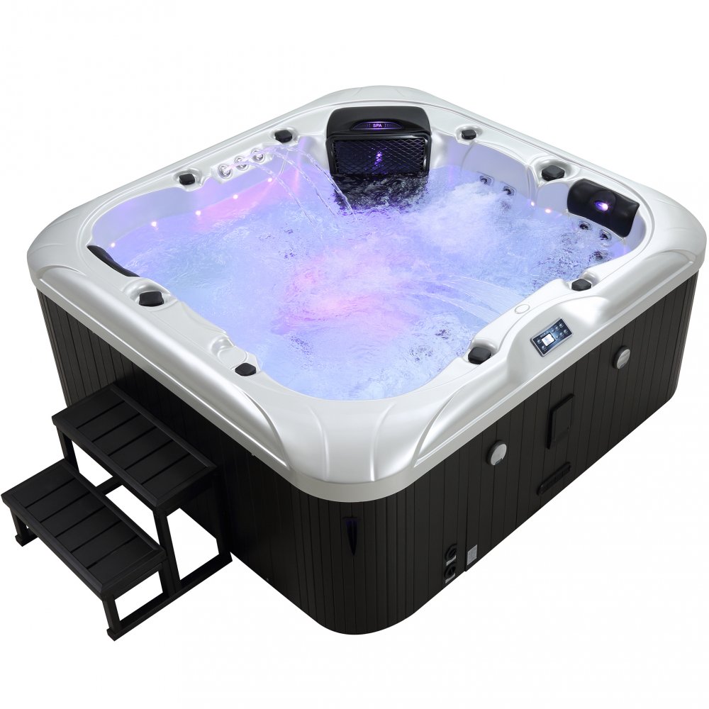 Spabadet är 2300x2100mm stor och 930mm högt. Badet rymmer upp till 5 personer. Vattenvolym ca 1360 liter vid normal fyllnadsgrad (ej max vad som får plats i karet, som vissa tillverkare uppger).