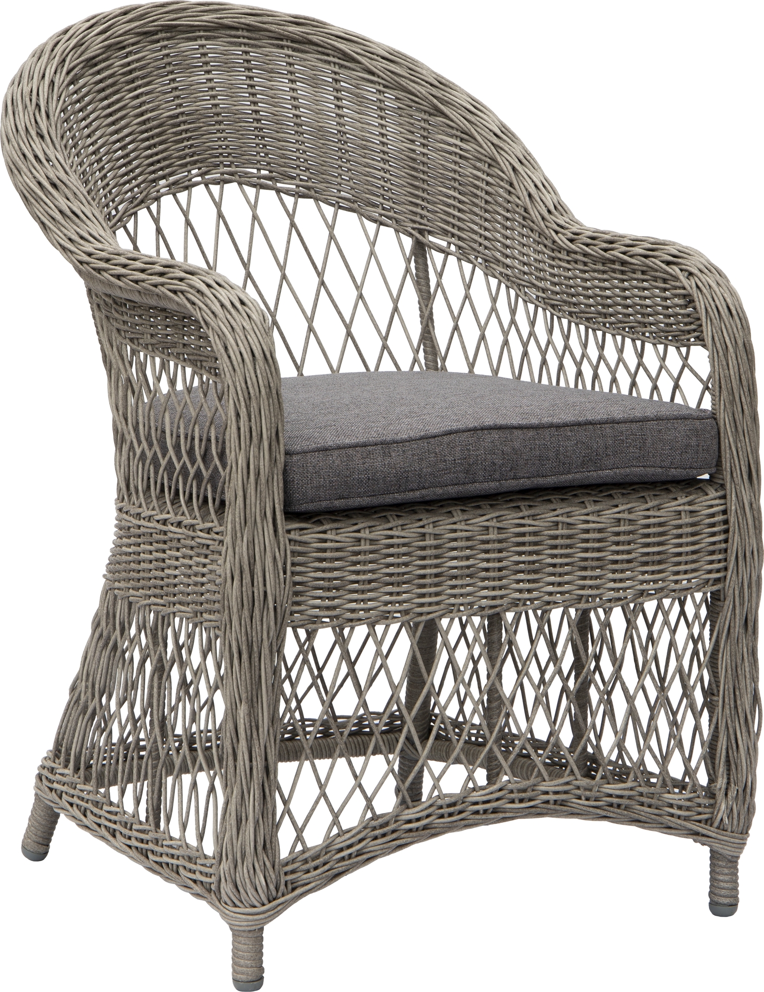 Den grå färgen ger ett stilrent och tidlöst uttryck som enkelt matchas med andra utemöbler, textilier och inredningsdetaljer. Stolen är tillverkad av väderbeständig konstrotting flätad runt en robust men lätt aluminiumstomme, vilket ger både stabilitet och enkel hantering. Detta gör den idealisk för utomhusbruk under hela utesäsongen.
