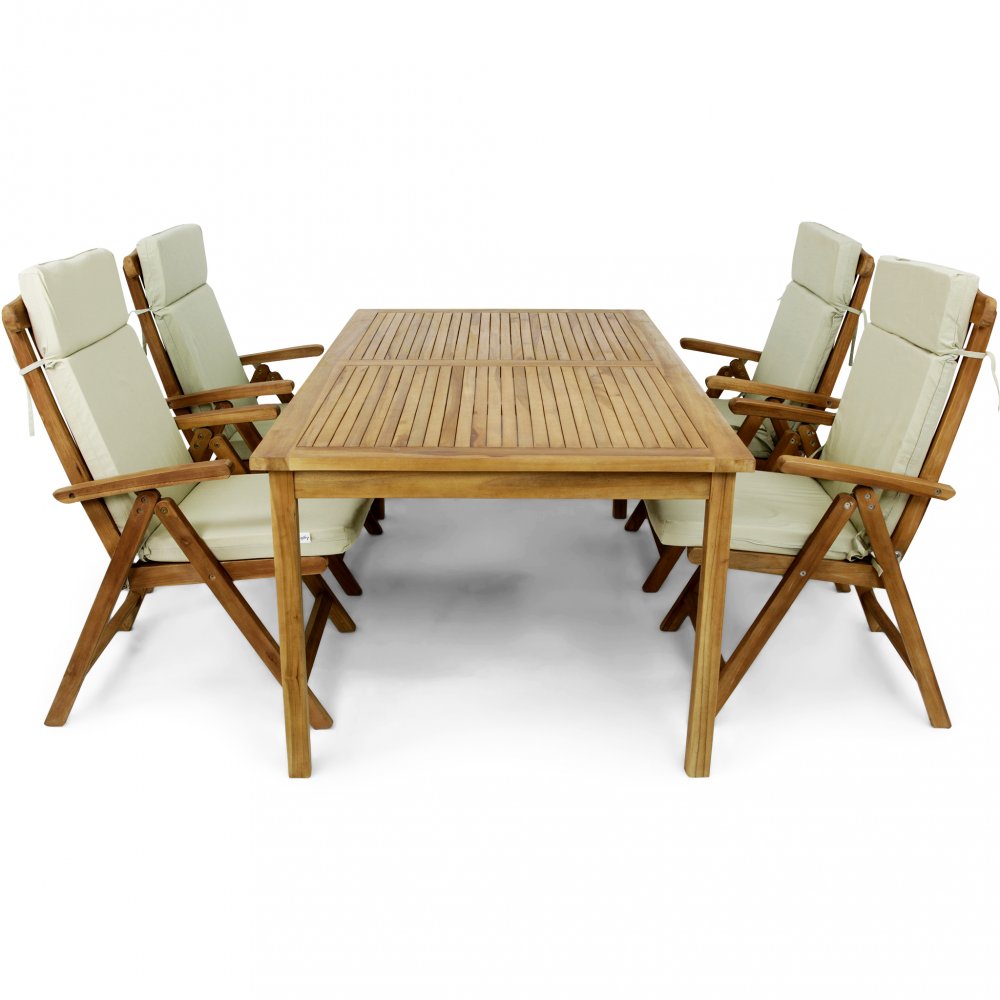 Mycket eleganta trädgårdsmöbler i teak med 4 st positionsstolar av hög kvalitet. Teaken i denna möbelgrupp är i standardkvalitet, dvs den kvalitet som används i nästan alla bättre utemöbler i teak på marknaden. Alla skruvar och beslag i positionsstolarna är tillverkade av rostfritt stål, vilket ökar livslängden.