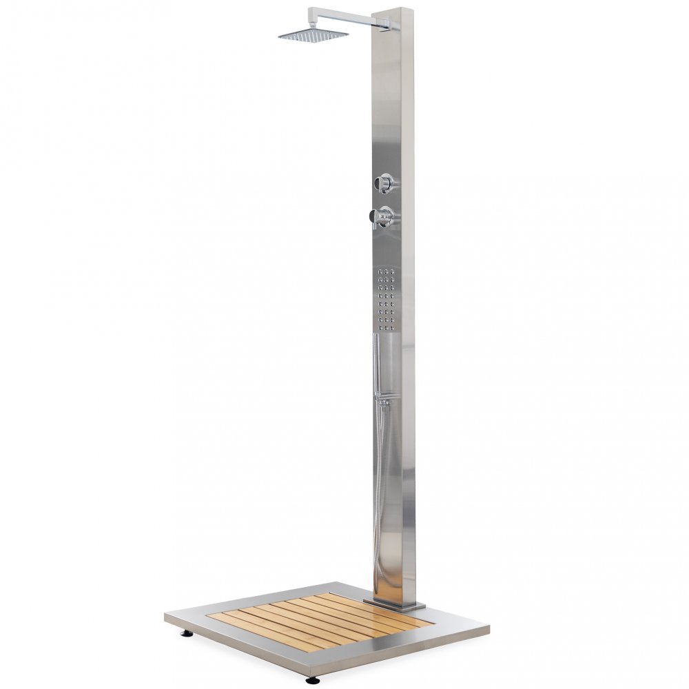 Komplett, multifunktionell utomhusdusch i rostfritt stål med en snygg borstad yta. Duschen har en exklusiv design med raka, moderna linjer och en basplatta (80 x 80 cm) i bambu-trä stilfullt inramad i rostfritt stål. Panelen har både toppdusch och handdusch och du alternerar enkelt mellan dessa med duschens reglage. Utomhusduschen är dessutom utrustad med vertikala massage-strålar som ger dig en exklusiv spa-upplevelse i din egen trädgård!