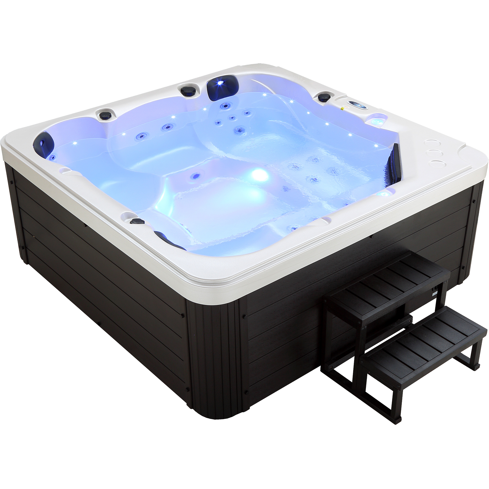 Spabadet är 215x215cm stor och 96cm högt. Badet rymmer upp till 5 personer. Vattenvolym ca 1300 liter vid normal fyllnadsgrad (ej max vad som får plats i karet, som vissa tillverkare uppger).