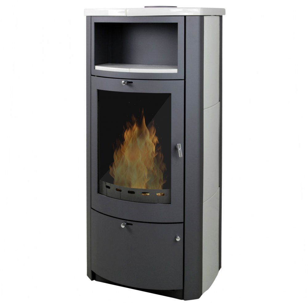 Kraftig vattenmantlad braskamin klädd med keramiska plattor och en effektivitet på hela 80 %. Kaminen har en nominell effekt på 8,4 kW varav 3.3 kW luft, och 5.1 kW vattenburen.