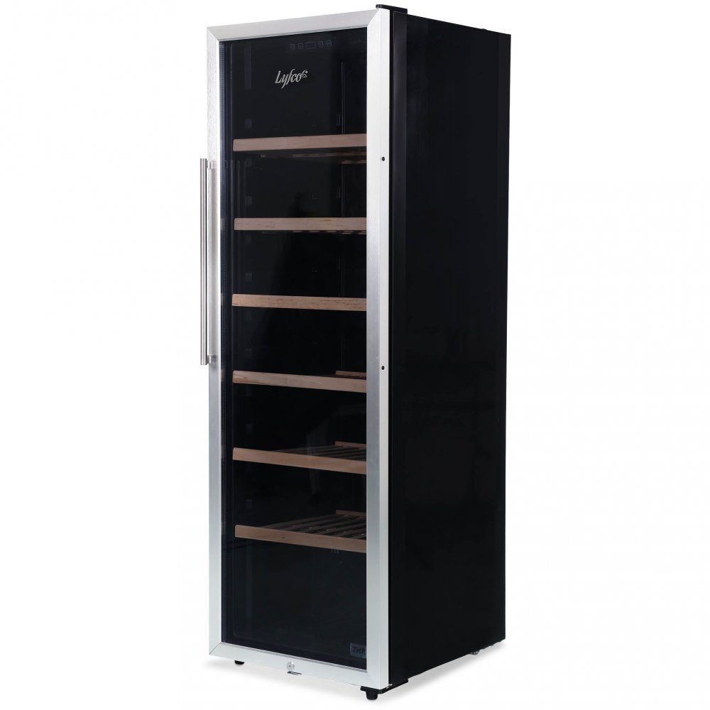 Prisvärd vinkyl från Lyfco i slim design som tillåter dig att förvara 147 flaskor av ditt favoritvin. Beroende på hur du väljer att fylla utrymmet kan kylen rymma fler eller färre flaskor. Kylen kommer i en svart snygg design med glasdörr, handtag i rostfritt stål och sex justerbara hyllor i trådmetall med träram där du kan placera etiketter med datum eller pris på vinet. Dörren är utrustad med säkerhetslås för att förhindra barn från att öppna och vinflaskor från att falla ur och gå sönder. Vinkylen har inbyggd LED-belysning och du styr enkelt temperatur och belysning med den praktiska touch-displayen på insidan av kylen. Dimensionerna är 545x600x1674mm (bredd x djup x höjd) och gör kylen till en snygg inredningsdetalj. Skäm bort nära och kära med ett perfekt kylt glas vin eller champagne!